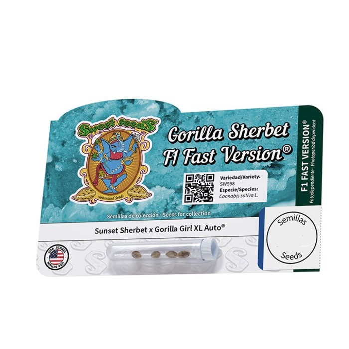 Varietà ibrida F1, risultato dell’incrocio tra un clone d’élite di Sunset Sherbet e della nostra varietà autofiorente Gorilla Girl XL Auto® (SWS82) [Gorilla Girl® x Sweet Gelato Auto® (SWS74 x SWS76)].